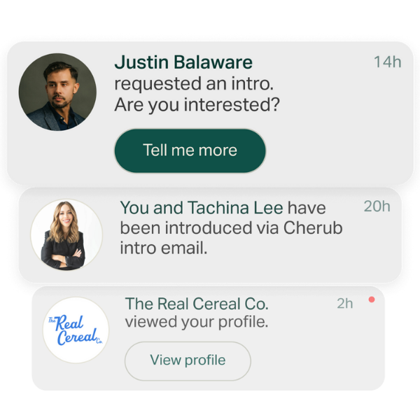 "Cherub introduced us to high-value investors across a range of sales, marketing, legal and creative fields. Experienced and diverse investors can deeply influence the success of a business, and our investors who we met through Cherub are all playing a big role in our plans. We love Cherub and couldn't say enough good things about our experience!"